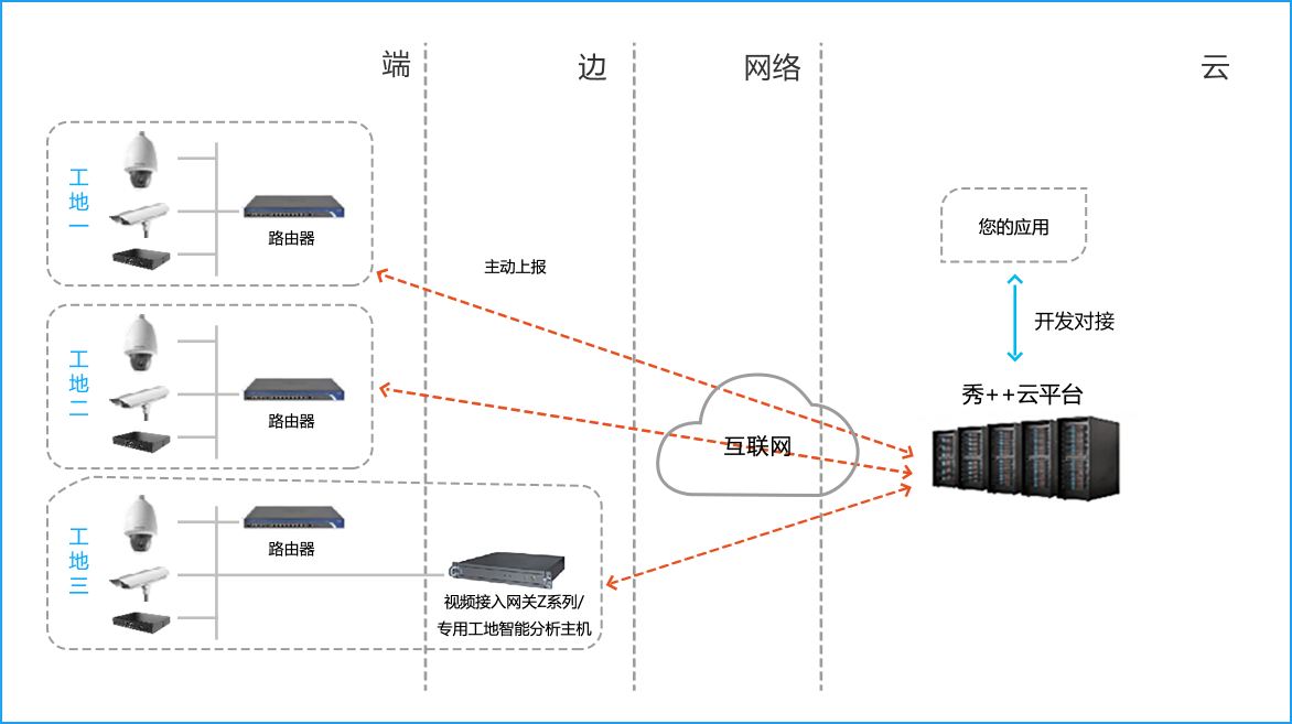 这种方式下,放置在周边环境、塔吊等场景的视频设备(摄像机、NVR等)一版情况下,都是通过4G/5G直接连到秀加加云平台上,这些设备必须主动上报协议,譬如海康ehome、 大华主动上报等。